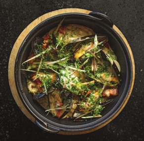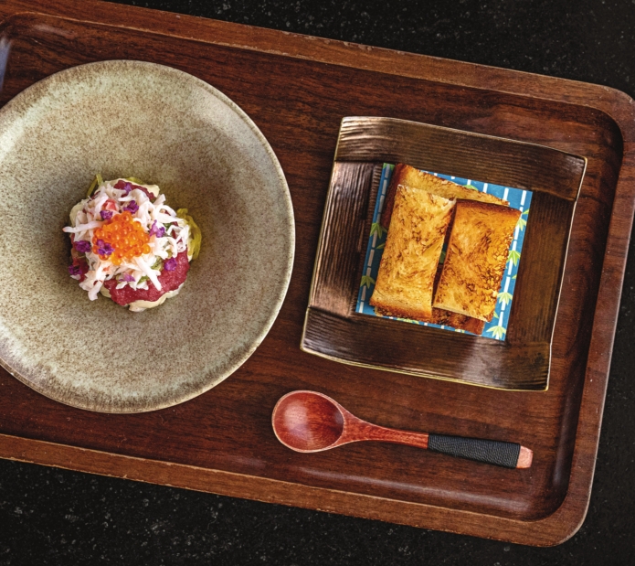 King crab monaka, top; udon and mussels with crème fraîche, garlic and bacon, left.  While securing reservations at Niki Nakayama and Carole Iida-Nakayama’s kaiseki showcase n/naka remains one of the toughest feats in the known universe, their Mid-City izakaya led by head chef Yoji Tajima slips far more quietly under the radar. Ease in with a plate of crudités alongside mochi flatbread (crisp but also enticingly elastic) and a smoky eggplant dip that calls to mind Persian kashke bademjan. A warm, gingery bowl of just-set tofu settles the senses. In the summer, look for cooling creations like King crab meat and uni dolloped with avocado dressing in an edible cup made of rice flour. Chillier nights call for mussels tangled in garlicky udon with crème fraîche and bacon. Skip the sushi for a donabe full of impeccably steamed rice and changing options such as autumnal mushrooms or soft-boiled egg and chicken thigh. In the spirit of izakaya, the beverage program is full of smart options that the staff can discuss in depth. Lead bartender Reed Windle, in particular, devises intricate cocktails that marry the Japanese-California ethos, driven by fruits and spices: Check out his Time Goes So Fast, which whirls together rye, anise hyssop, herbal Benedictine, aged sake and sake vermouth. — B.A. 4566 W. WASHINGTON BLVD., LOS ANGELES, (323) 879-9455 l N-SOTO.COM See also