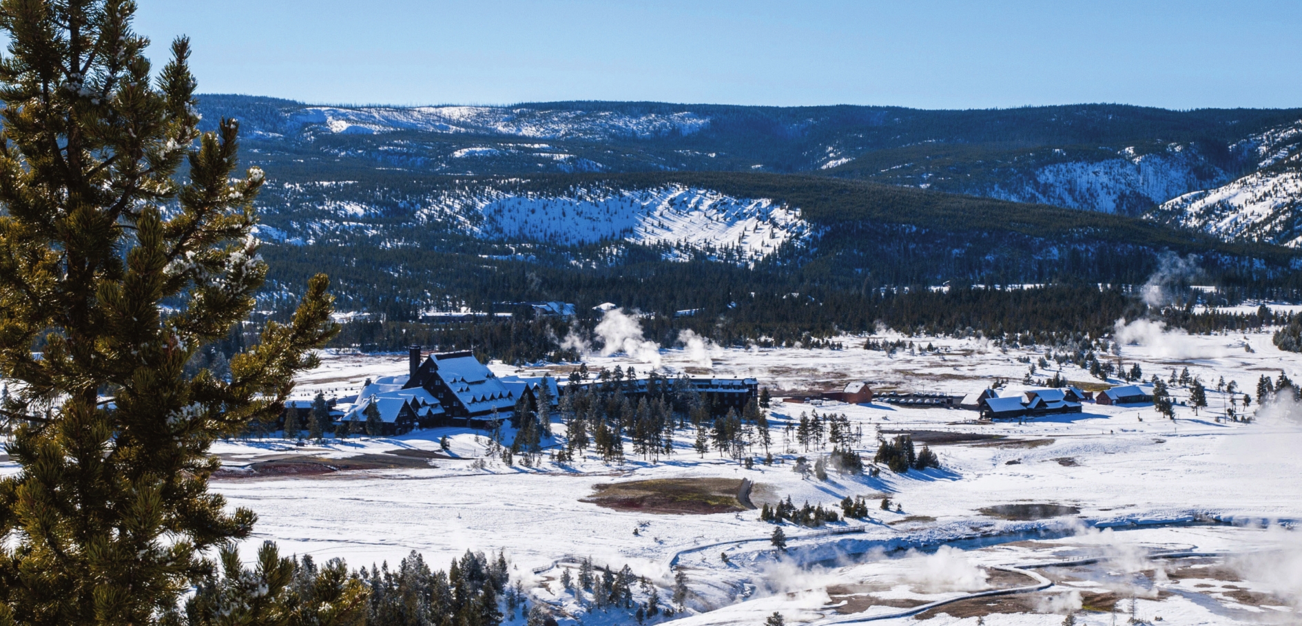The only overnight lodging inside the park during the colder months is the Mammoth Hot Springs Hotel and Old Faithful Snow Lodge. Both are open mid-December to early March. You can drive to Mammoth Hot Springs, but reaching Old Faithful in winter requires a snowcoach transfer.