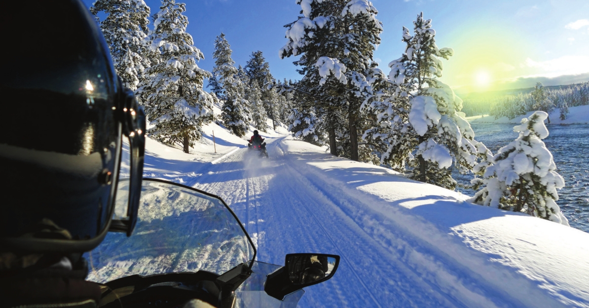 Outfitters in the Montana towns of Gardiner and West Yellowstone offer guided snowcoach and snowmobile tours to iconic spots like Old Faithful and Yellowstone Falls.