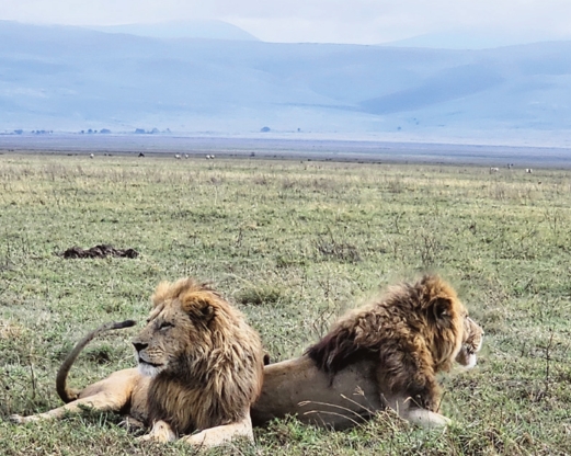Later, we spotted two full-grown male lions lounging around, two brothers, for as Festo reminded us, male lions only form coalitions with their brothers or cousins. Those two wandered around a bit, then flopped down for a snooze just steps away from our truck.