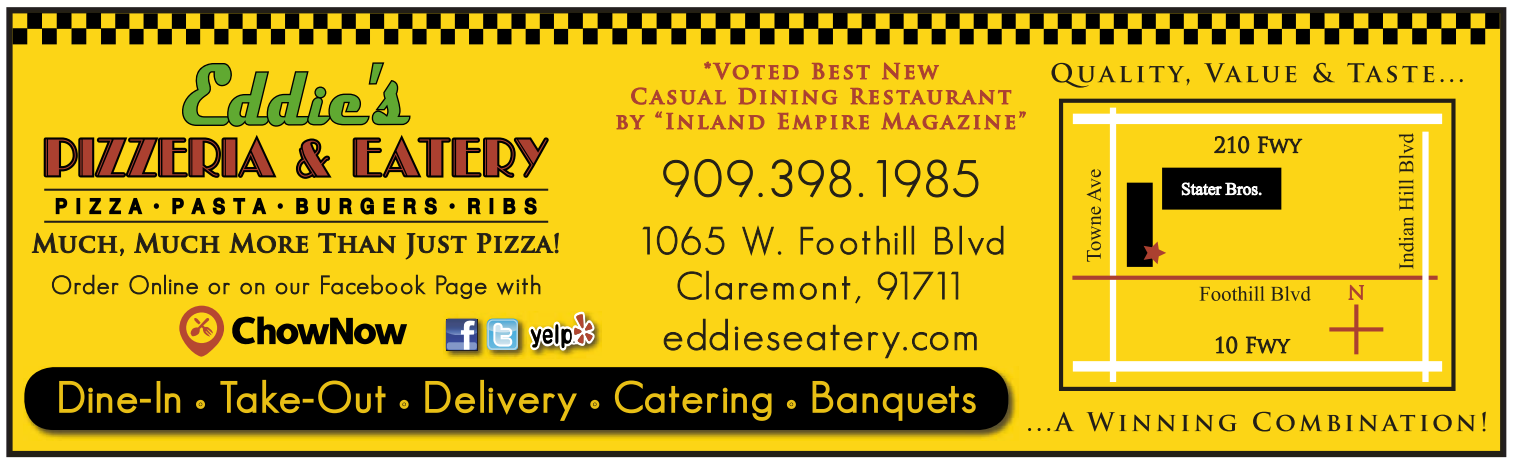 Much, Much More Than Just Pizza! Order Online or on our Facebook Page with *Voted Best New Casual Dining Restaurant by “Inland Empire Magazine” 9 0 9 . 398 . 1985 1065 W. Fo othill Blvd Claremont, 91711 eddieseatery.com Dine-In . Take-Out . Delivery . Catering . Banquets Quality, Value & Taste... 210 Fwy Stater Bros. Foothill Blvd 10 Fwy ...A Winning Combination! N