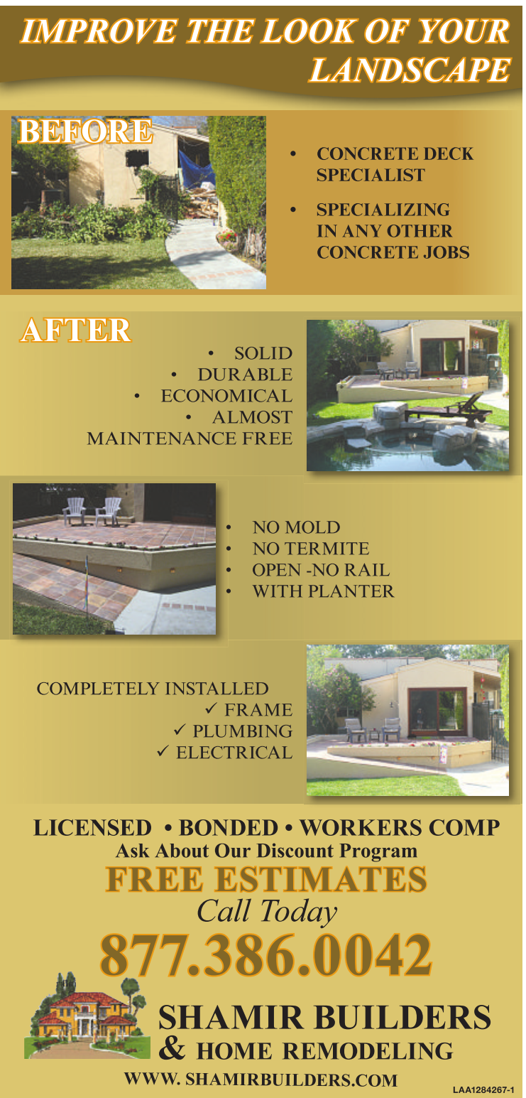IMPROVE THE LOOK OF YOUR LANDSCAPE BEFORE • CONCRETE DECK SPECIALIST • SPECIALIZING IN ANY OTHER CONCRETE JOBS AFTER • SOLID • DURABLE • ECONOMICAL • ALMOST MAINTENANCE FREE • NO MOLD • NO TERMITE • OPEN -NO RAIL • WITH PLANTER COMPLETELY INSTALLED FRAME PLUMBING ELECTRICAL LICENSED • BONDED • WORKERS COMP Ask About Our Discount Program FREE ESTIMATES Call Today 877. 386.0042 SHAMIR BUILDERS & HOME REMODELING LAA1284267-1