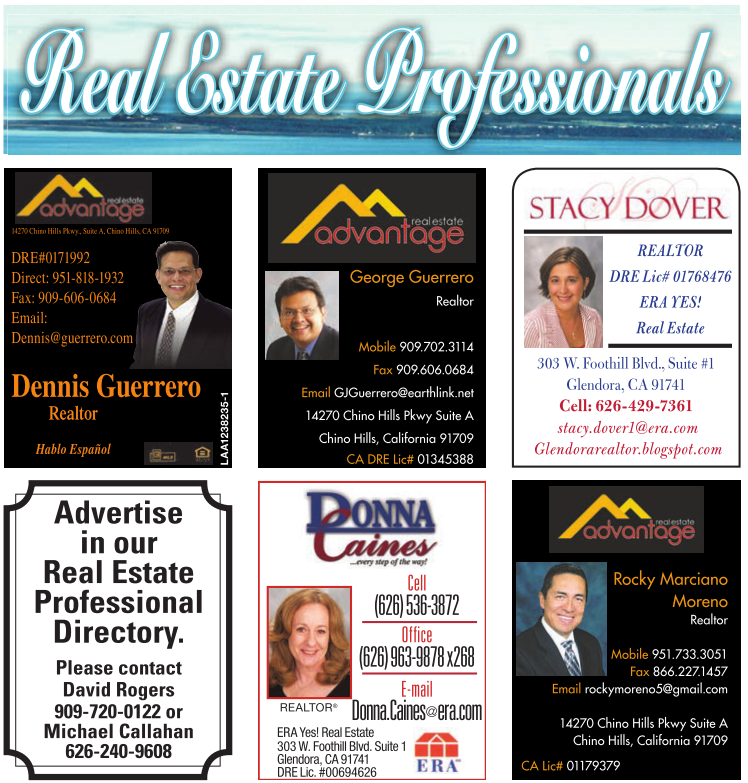 Real Estate Professionals 14270 Chino Hills Pkwy., SuiteA,Chino Hills, CA 91709 DRE#0171992 Direct: 951-818-1932 Fax: 909-606-0684 Email: Dennis@guerrero.com Dennis Guerrero Realtor Hablo Español Advertise in our Real Estate Professional Directory. Please contact David Rogers 909-720-0122 or Michael Callahan 626-240-9608 George Guerrero Realtor Mobile 909.702.3114 Fax 909.606.0684 Email GJGuerrero@earthlink.net 14270 Chino Hills Pkwy Suite A Chino Hills, California 91709 CA DRE Lic# 01345388 REALTOR ® ERAYes!Real Estate 303W.Foothill Blvd.Suite 1 Glendora, CA 91741 DRELic.#00694626 Cell (626)536-3872 Office (626)963-9878x268 E-mail Donna.Caines@era.com REALTOR DRELic#01768476 ERAYES! Real Estate 303 W. Foothill Blvd., Suite#1 Glendora,CA91741 Cell:626-429-7361 stacy.dover1@era.com Glendorarealtor.blogspot.com Rocky Marciano Moreno Realtor Mobile 951.733.3051 Fax 866.227.1457 Email rockymoreno5@gmail.com 14270 Chino Hills Pkwy Suite A Chino Hills, California 91709 CA Lic# 01179379