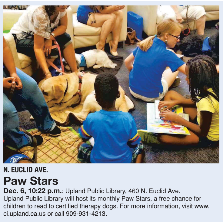 Nov. 20 Discovery Club: Use Your Words 4 p.m., Paul A. Biane Library, 12505 Cultural Center Drive The Paul A. Biane Library will hold Discovery Club: Use Your Words, a reading event for ages 6 to 12 and a caregiver. For more information, visit www.cityofrc.us or call 909-477-2720.