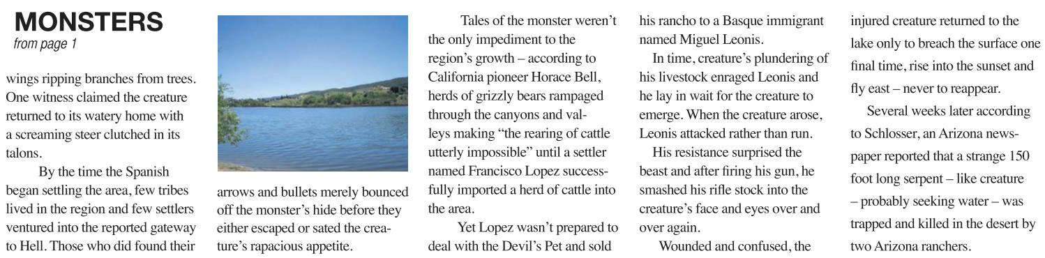Before it became known as Elizabeth Lake, Father Junipero Sierra named it “La Laguna de Diablo” (the Devil’s Lake) because local tribes believed that the devil formed the lake as a passage to the underworld and left it protected by his “pet,” a monster described by Spooky California author S.E. Schlosser as possessing the “wings of a giant bat, the body of a dragon, a round flattened head and the crafty eyes of a serpent.” The early Tataviam, Kitanemuk and Serrano tribes as well as the Spanish settlers believed that the devil’s pet hibernated for long periods of time, then awakened and arose from the lake to rampage across the area, devouring livestock, wild game and humans alike before it returned to its watery home.