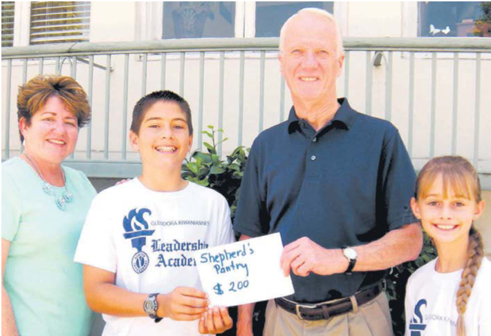 Janna Wells, left, president of the Glendora Kiwaniannes club, and student Leadership Academy graduates Aydan Green and Morgan Lunde, present check to Phil Huisman, director of Shepherd’s Pantry. The 21 students enrolled in the program June 1-5, collected 20,000 pennies in one week, or $200 as a community service project, and donated the funds to Shepherd’s Pantry, which distributes food and clothing to families. Shepherd’s Pantry provides a range of services and is located at 657 E. Arrow Highway, Suite J, Glendora, CA 91740. For more information, call 626 852-7630 to leave a message or visit www.shepherdspantry.com