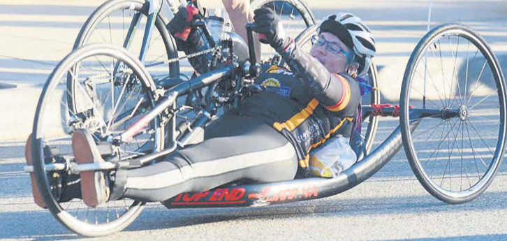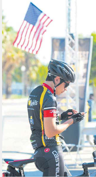 Hundreds of bike racers of all levels this month ascended on downtown Upland for the start of the 11th annual Tour de Foothills bike races, where riders were challenged to complete routes along the foothills from Rancho Cucamonga to Pasadena. Left, Alexander Castro, 21, of Rancho Cucamonga, checks his finishing time. Right, Jenna Rollman, 27, also of Rancho Cucamonga, powers her way on three wheels, unstoppable despite a riding accident in 2013. Paul Alvarez photos
