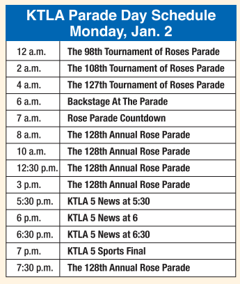 The parade begins at 8 a.m., broadcast live to the world. Watch the parade on channel 5 or on KTLA’s live stream at ktla.com. For band coverage without commentary, watch Facebook.com/ktla5 Following the conclusion of the live parade, KTLA 5 will broadcast multiple encores of the 2017 Rose Parade.