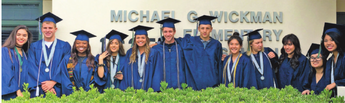 Wearing graduation caps and gowns, Chino Hills High School seniors closed the Soring school year recently traveling by school bus to Wickman, Chaparral, Glenmeade, and Oak Ridge elementary schools in Chino Hills, and Cal Aero Preserve Academy in Chino, to say goodbye to their old teachers, and inspire younger students. This is a new event for the Chino Hills High seniors, Wickman Elementary School Principal Tom Rummell said. At Wickman, the seniors walked the campus “promotion-style.” They were cheered and high-fived by the elementary students.