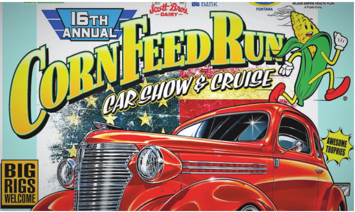 The 16th Annual Corn Feed Run Car Show & Cruise, presented by Kiwanis Club of Chino and City of Chino, will be April on the City Hall lawn and streets of downtown Chino. More than 800 vehicles expected and registration is open to all pre-1975 cars and all working show trucks. Vendor spaces are available. The event features contests, vendors, trophies, raffle, food and music, and a big display of operating antique engines. All proceeds go to local youth and senior charities of the Chino Kiwanis. For information, visit www.chinokiwanis.com or contact cornfeedrun@aol.com or (909) 591-4162. See also