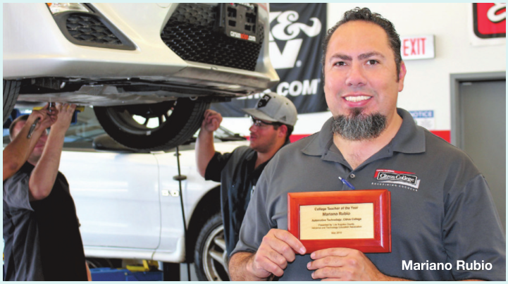 Mariano Rubio, Citrus College Automotive Technology instructor, has been recognized as the “College Teacher of the Year” by the California Industrial and Technology Education Association (CITEA). Nominated by his former high school automotive teacher, Brad Walsh, Rubio was honored at the Los Angeles chapter of CITEA’s annual awards banquet in front of nearly 60 educators, students and industry professionals. “I was completely surprised and humbled to win this award from CITEA,” said Rubio. “It felt great to be recognized by my peers, especially with my former high school instructor in attendance. I am mostly glad that news is spreading about the success of the automotive program at Citrus College.” Rubio’s teaching career began when his former Citrus College instructor, Dennis Korn, invited him to return as an instructor. In the nine years since he began teaching, Rubio has played a significant role in advancing career technical education at the college, including successfully reinvigorating the medium and heavy diesel truck technology program, creating a new stationary power generation program, and increasing employment rates among former students. – Contributed by Citrus College See also