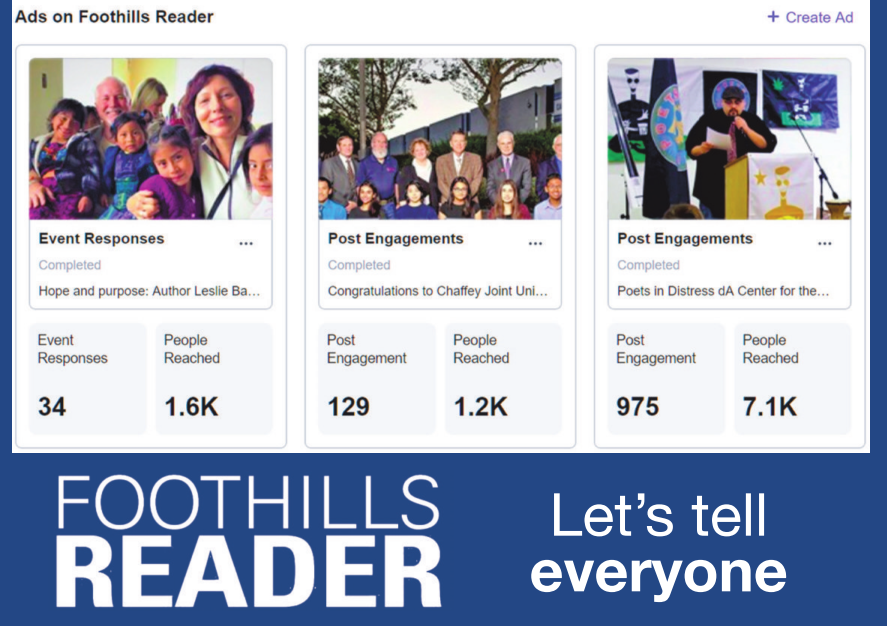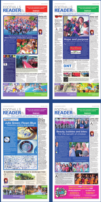 Foothills Reader offers extensive community calendars, advertising and announcements throughout Foothills neighborhoods in eastern Los Angeles and western San Bernardino counties. Locally written and produced, the section has appeared weekly in the Sunday Los Angeles Times since 2012, and now online @foothillsreader on Facebook. Reader calendars span the widest range of events, from public and private schools, to a wealth of arts organizations and the smallest local clubs, and expansive listings of car shows and related events. Focused only on community events and local advertising, Foothills Reader is an effective platform for generating awareness for community organizations, businesses and non-profits. If your community group is not getting the word out, maybe its time to tell the neighbors. All it takes is an email. Send your organization’s releases as email to Steve O’Sullivan at foothillsreader@aol.com. Advertising in the Reader is cost effective and engages local consumers. To learn more about advertising, contact Peggy del Toro at pdeltoro4@gmail.com, or call (951) 233-0217.