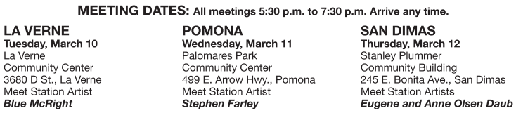 The station artists will also be available to discuss the public artwork planned for their station at city-specific meetings; see schedule below.
