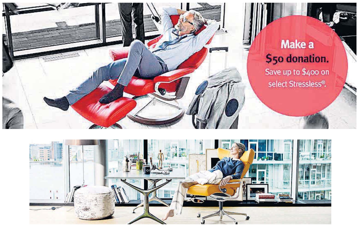 Donate a minimum of $50 to the American Diabetes Association or any charity of your choice, and receive up to $400 off any Stressless seating. Last year, Ekornes raised more than $275,000 during our charity promotion. The promotion runs through Jan. 18, 2016.