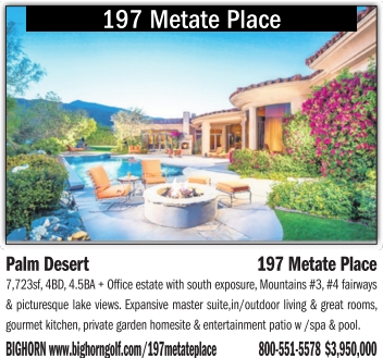 197 Metate Place PalmDesert 197 Metate Place 7,723sf, 4BD,4.5BA +Office estate with south exposure, Mountains#3, #4 fairways &picturesque lake views. Expansive master suite,in/outdoor living &great rooms, gourmet kitchen, private garden homesite &entertainment patiow/spa&pool. BIGHORN www.bighorngolf.com/197metateplace 800-551-5578 $3,950,000