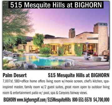 515 Mesquite Hills at BIGHORN PalmDesert 515 MesquiteHills at BIGHORN 7,007sf, 5BD+office home offers living room w/movie screen, chef’s kitchen, spainspired master,family room w/2 guest suites,great room open to outdoor living room &entertainment patio w/ pool, spa &Canyons fairway views. BIGHORN www.bighorngolf.com/515MesquiteHills 800-551-5578 $4,700,000