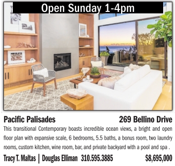 Open Sunday 1-4pm PacificPalisades 269 Bellino Drive This transitional Contemporary boasts incredible ocean views, abright and open floor plan with expansive scale, 6bedrooms, 5.5 baths, abonus room, two laundry rooms, customkitchen,wine room, bar,and private backyard with apool and spa . Tracy T. Maltas|Douglas Elliman 310.595.3885 $8,695,000