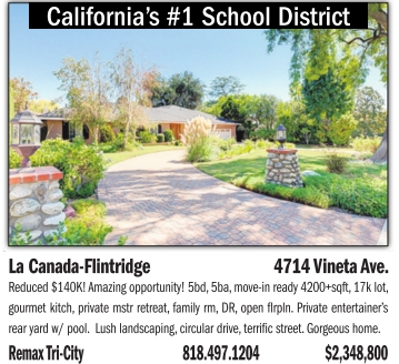 California’s #1 School District La Canada-Flintridge 4714 Vineta Ave. Reduced$140K! Amazing opportunity! 5bd, 5ba,move-inready4200+sqft, 17klot, gourmet kitch, private mstr retreat, family rm, DR, open flrpln. Privateentertainer’s rearyard w/ pool. Lushlandscaping, circular drive, terrificstreet. Gorgeous home. Remax Tri-City 818.497.1204 $2,348,800