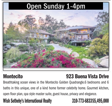 Open Sunday 1-4pm Montecito 923Buena VistaDrive Breathtakingocean views in the Montecito GoldenQuadrangle.6 bedrooms and 6 bathsinthisunique, one of akindhome former celebrity home. Gourmet kitchen, open floor plan, spastyle mastersuite,guest house,privacy and elegance. Wish Sotheby’sInternationalRealty 310-773-6833$5,495,000