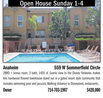 2BRD +bonus room,3bath, 1455 sf.Scenic view tothe Disney fireworks makes thishardwood floored townhouse standout in agatedresortstyle community that includesswimming pool and jacuzzis.Walking distancetoDisneyland, restaurants..