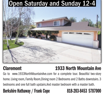 Open Saturday and Sunday 12-4 Claremont 1933 NorthMountain Ave Go to www.1933NorthMountainAve.com for acomplete tour. Beautiful two-story home. Living room,Family Room,Dining room2Bedroomsand 2Baths downstairs.3 bedrooms and one full bath upstairs.Andmaster bedroomwith amasterbath. Berkshire Hathaway /FrankCope 818-203-8453 $787000