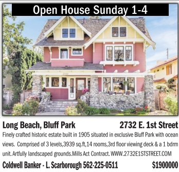 Open House Sunday 1-4 Long Beach, Bluff Park 2732 E. 1st Street Finely crafted historic estate built in 1905 situated in exclusive Bluff Park with ocean views. Comprised of 3 levels,3939 sq.ft,14 rooms,3rd floor viewing deck & a 1 bdrm unit.Artfully landscaped grounds.Mills Act Contract.WWW.2732E1STSTREET.COM Coldwell Banker - L. Scarborough 562-225-0511 $1900000