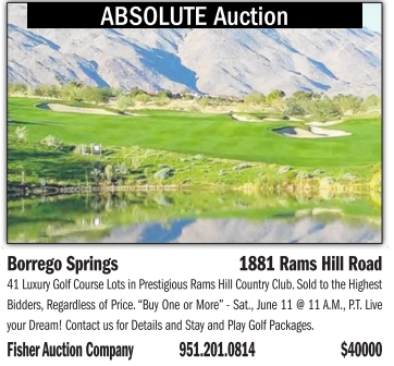 ABSOLUTE Auction Borrego Springs 1881 Rams Hill Road 41 Luxury Golf Course Lots in Prestigious Rams Hill Country Club. Sold to the Highest Bidders, Regardless of Price. “Buy One or More” - Sat., June 11 @ 11 A.M., P.T. Live your Dream! Contact us for Details and Stay and Play Golf Packages. Fisher Auction Company 951.201.0814 $40000