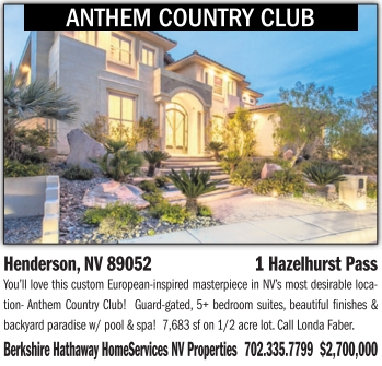 ANTHEM COUNTRY CLUB Henderson, NV 89052 1 Hazelhurst Pass You’ll love this custom European-inspired masterpiece in NV’s most desirable location- Anthem Country Club! Guard-gated, 5+ bedroom suites, beautiful finishes & backyard paradise w/ pool & spa! 7,683 sf on 1/2 acre lot. Call Londa Faber. Berkshire Hathaway HomeServices NV Properties 702.335.7799 $2,700,000