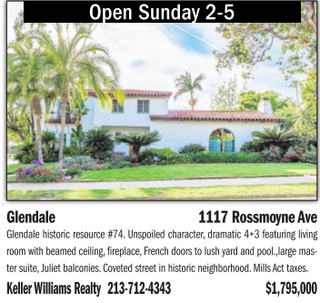 Open Sunday 2-5 Glendale 1117 Rossmoyne Ave Glendale historic resource #74. Unspoiled character, dramatic 4+3 featuring living room with beamed ceiling, fireplace, French doors to lush yard and pool.,large master suite, Juliet balconies. Coveted street in historic neighborhood. Mills Act taxes. Keller Williams Realty 213-712-4343 $1,795,000
