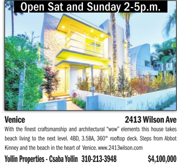 Open Sat and Sunday 2-5p.m. Venice 2413 Wilson Ave With the finest craftsmanship and architectural “wow” elements this house takes beach living to the next level. 4BD, 3.5BA, 360° rooftop deck. Steps from Abbot Kinney and the beach in the heart of Venice. www.2413wilson.com Yollin Properties - Csaba Yollin 310-213-3948 $4,100,000