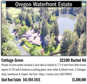 Oregon Waterfront Estate Cottage Grove 32100 Rachel Rd Private 16 acre estateincludes 5acre lake w/islands&771 ft river front.Main house approx 9,725 sqft &featuresaputting green, winecellar &billiardroom. 2Cottages, shop, boathouse &chapel.See Tour:https://vimeo.com/166749953 Sixel Real Estate 541-954-1915 $1,600,000