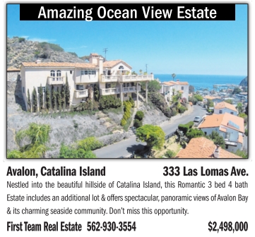 Amazing Ocean View Estate Avalon, Catalina Island 333 Las Lomas Ave. Nestled into the beautiful hillside of Catalina Island, this Romantic 3 bed 4 bath Estate includes an additional lot & offers spectacular,panoramic views ofAvalon Bay & its charming seaside community. Don’t miss this opportunity. First Team Real Estate 562-930-3554 $2,498,000
