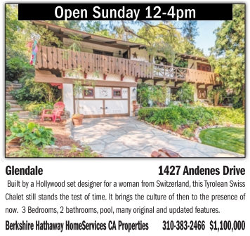 Open Sunday 12-4pm Glendale 1427 AndenesDrive Built by aHollywoodset designer for awomanfrom Switzerland,this Tyrolean Swiss Chalet still stands the testoftime.Itbrings the cultureofthentothe presence of now. 3Bedrooms, 2bathrooms, pool, many original and updated features. Berkshire HathawayHomeServices CA Properties 310-383-2466 $1,100,000