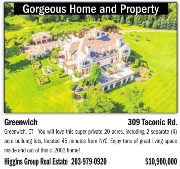 Gorgeous Home and Property Greenwich 309Taconic Rd. Greenwich, CT -You will love this super-private 20acres,including 2separate (4) acre building lots,located 45minutes from NYC.Enjoy tons ofgreat living space inside andout of thisc.2003 home! Higgins Group Real Estate 203-979-0920 $10,900,000