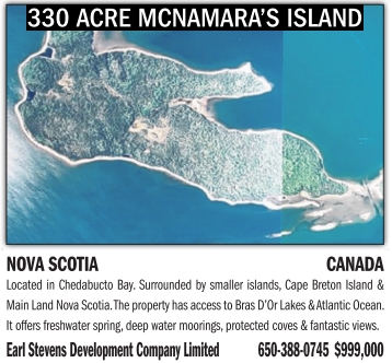 330 ACRE MCNAMARA’S ISLAND NOVA SCOTIA CANADA Located in Chedabucto Bay. Surrounded by smaller islands, Cape Breton Island & Main Land Nova Scotia.The property has access to Bras D’Or Lakes &Atlantic Ocean. It offers freshwater spring, deep water moorings, protected coves & fantastic views. Earl Stevens Development Company Limited 650-388-0745 $999,000