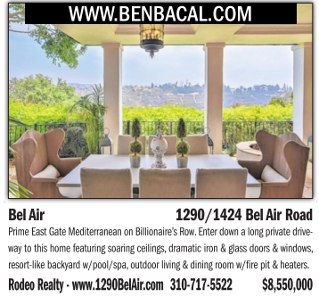 WWW.BENBACAL.COM Bel Air 1290/1424 Bel Air Road Prime East Gate Mediterranean on Billionaire’s Row. Enter down a long private driveway to this home featuring soaring ceilings, dramatic iron & glass doors & windows, resort-like backyard w/pool/spa, outdoor living & dining room w/fire pit & heaters. Rodeo Realty - www.1290BelAir.com 310-717-5522 $8,550,000