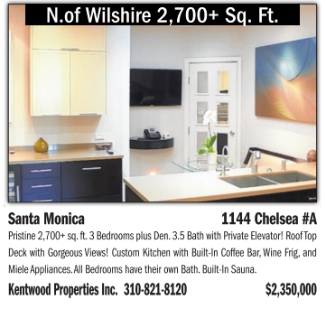 N.of Wilshire 2,700+ Sq. Ft. Santa Monica 1144Chelsea #A Pristine 2,700+ sq.ft. 3Bedrooms plus Den.3.5Bath withPrivateElevator! RoofTop Deckwith Gorgeous Views! Custom Kitchen withBuilt-In Coffee Bar,Wine Frig,and Miele Appliances.All Bedroomshave their own Bath.Built-In Sauna. Kentwood Properties Inc. 310-821-8120 $2,350,000