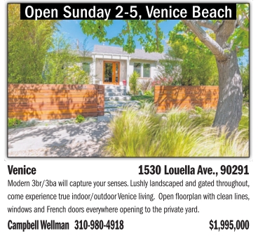Open Sunday 2-5, Venice Beach Venice 1530 Louella Ave., 90291 Modern 3br/3ba will captureyour senses. Lushly landscapedand gatedthroughout, comeexperience true indoor/outdoorVenice living. Open floorplan with clean lines, windows and French doors everywhere openingtothe privateyard. Campbell Wellman 310-980-4918 $1,995,000