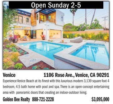 Open Sunday 2-5 Venice 1106 Rose Ave.,Venice, CA 90291 ExperienceVenice Beach at its finest with this luxurious modern 3,139square foot 4 bedroom, 4.5 bath home withpool and spa.Thereisanopen-concept entertaining area with panoramicdoorsthatcreating an indoor-outdoor living. Golden Bee Realty 888-721-2228 $3,095,000