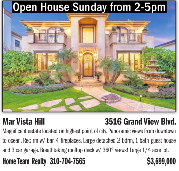 Open House Sunday from 2-5pm MarVista Hill 3516GrandViewBlvd. Magnificent estatelocated on highest point of city.Panoramicviews from downtown to ocean. Rec rm w/ bar,4fireplaces.Largedetached 2bdrm,1bathguesthouse and 3car garage. Breathtaking rooftop deckw/360°views!Large 1/4acrelot. Home Team Realty 310-704-7565 $3,699,000