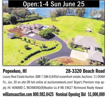 Open:1-4 Sun June 25 Pepeekeo, HI 28-3320 BeachRoad LuxuryReal EstateAuction.8BR 7.5BA 8,845sf oceanfront estate.Auctions: 11:00AM Fri., Jun. 30 on site OR bidonline at auctionnetwork.com! Buyer’sPremium mayapply.HI: HOWARD C. RICHMOND(R)Realtor Lic.# RB-19627 Richmond Realty Hawaii williamsauction.com 800.982.0425 Nominal OpeningBid $1,000,000