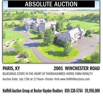 ABSOLUTE AUCTION PARIS, KY 2001 WINCHESTER ROAD BLUEGRASSESTATEINTHE HEART OF THOROUGHBRED HORSE FARM ROYALTY! Auction Date: July 13th at 12 Noon--Onsite--Visitwww.HalfhillAuctions.com HalfhillAuctionGroup at Rector Hayden Realtors 859-338-5764 $9,950,000