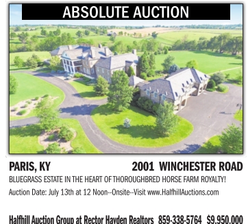BLUEGRASSESTATEINTHE HEARTOFTHOROUGHBRED HORSE FARM ROYALTY! Auction Date: July 13th at 12 Noon--Onsite--Visitwww.HalfhillAuctions.com