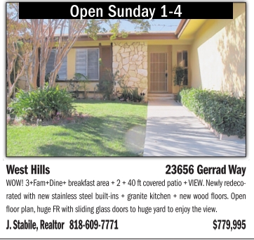 Open Sunday 1-4 West Hills 23656 Gerrad Way WOW! 3+Fam+Dine+breakfastarea +2+40ftcovered patio +VIEW.Newly redecorated with newstainless steel built-ins +granite kitchen +new wood floors.Open floor plan, huge FR with sliding glassdoorstohugeyardtoenjoy theview. J. Stabile, Realtor 818-609-7771 $779,995