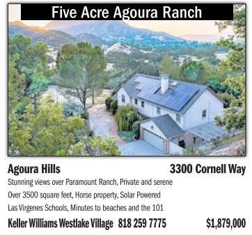 Five Acre Agoura Ranch AgouraHills Stunning viewsoverParamount Ranch,Private and serene Over 3500 square feet, Horse property, Solar Powered Las Virgenes Schools, Minutes to beaches and the 101 3300 Cornell Way KellerWilliams Westlake Village 818 259 7775 $1,879,000