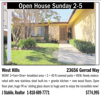 Open House Sunday 2-5 West Hills 23656 Gerrad Way WOW! 3+Fam+Dine+breakfastarea +2+40ftcovered patio +VIEW.Newly redecorated with newstainless steel built-ins +granite kitchen +new wood floors.Open floor plan, hugeFRw/sliding glass doors to huge yardtoenjoy the incredible view! JStabile, Realtor 1-818-609-7771 $774,995