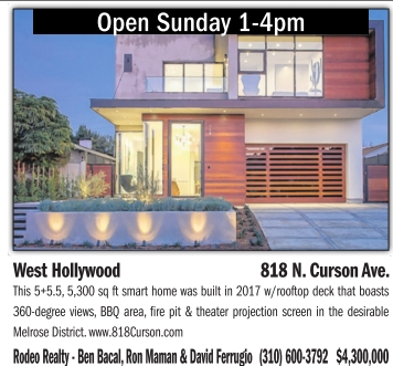 Open Sunday 1-4pm West Hollywood 818 N. Curson Ave. This 5+5.5, 5,300 sq ft smarthome was built in 2017 w/rooftopdeckthat boasts 360-degree views, BBQ area, fire pit &theater projection screen inthe desirable Melrose District.www.818Curson.com RodeoRealty -Ben Bacal, Ron Maman &DavidFerrugio (310)600-3792 $4,300,000