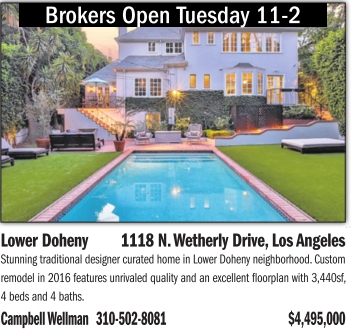 Brokers Open Tuesday 11-2 Lower Doheny 1118 N.WetherlyDrive, LosAngeles Stunning traditional designer curated homeinLower Doheny neighborhood. Custom remodel in 2016 features unrivaledquality andanexcellent floorplan with 3,440sf, 4beds and 4baths. Campbell Wellman 310-502-8081 $4,495,000