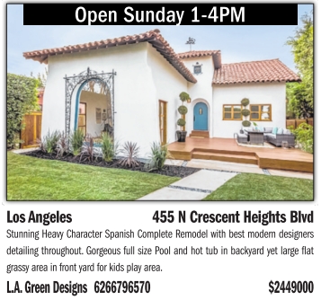 Open Sunday 1-4PM Los Angeles 455 NCrescent Heights Blvd Stunning Heavy Character Spanish Complete Remodel with best modern designers detailing throughout. Gorgeous full size Pooland hottub in backyard yet large flat grassy area in front yard for kids play area. L.A.Green Designs 6266796570 $2449000