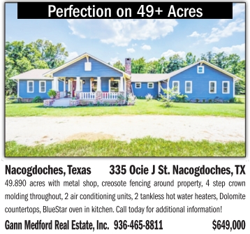 Perfection on 49+ Acres Nacogdoches,Texas 335OcieJSt. Nacogdoches,TX 49.890 acres with metal shop, creosote fencing around property, 4 step crown molding throughout, 2air conditioning units, 2tankless hot water heaters,Dolomite countertops,BlueStaroven in kitchen. Call today for additional information! Gann Medford Real Estate,Inc. 936-465-8811 $649,000